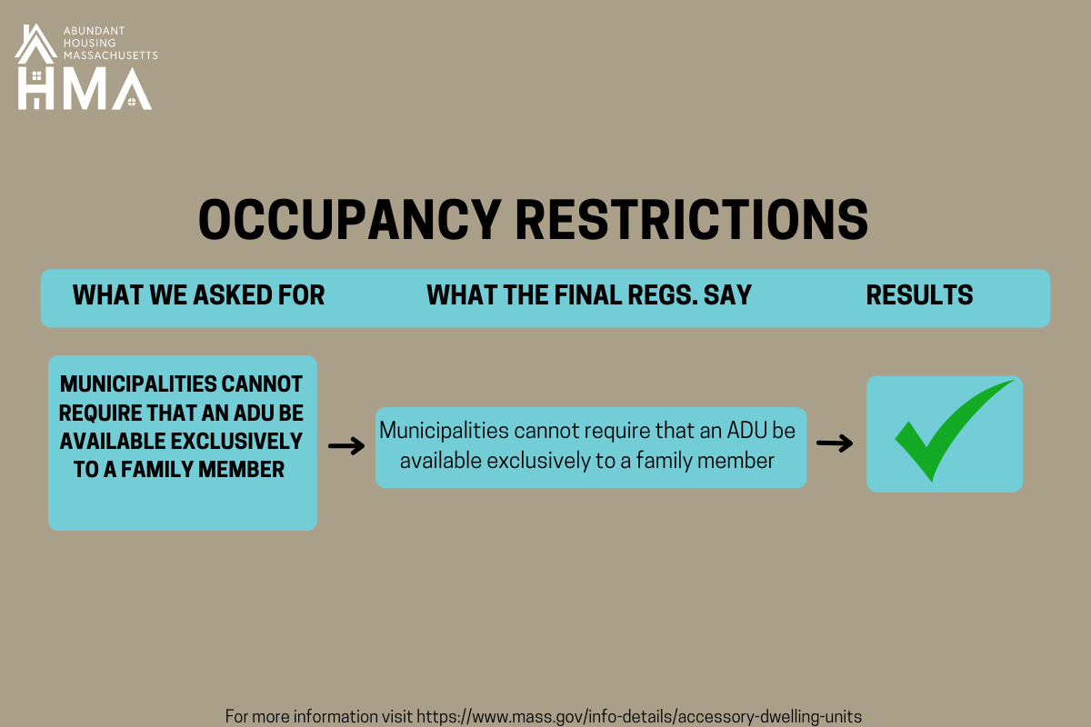 Now that the public comment period has closed, EOHLC will take the next few weeks to review the submitted comments and potentially incorporate them into the final regulations. While a date not been set, EOHLC plans to release final regulations before the effective date of the ADU law, February 2nd, 2025.