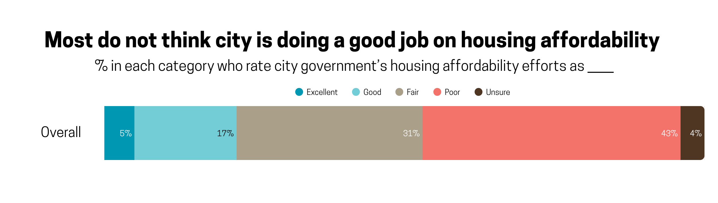 Three-quarters of residents say city government is doing only a fair (31%) or poor (43%) job on housing affordability.