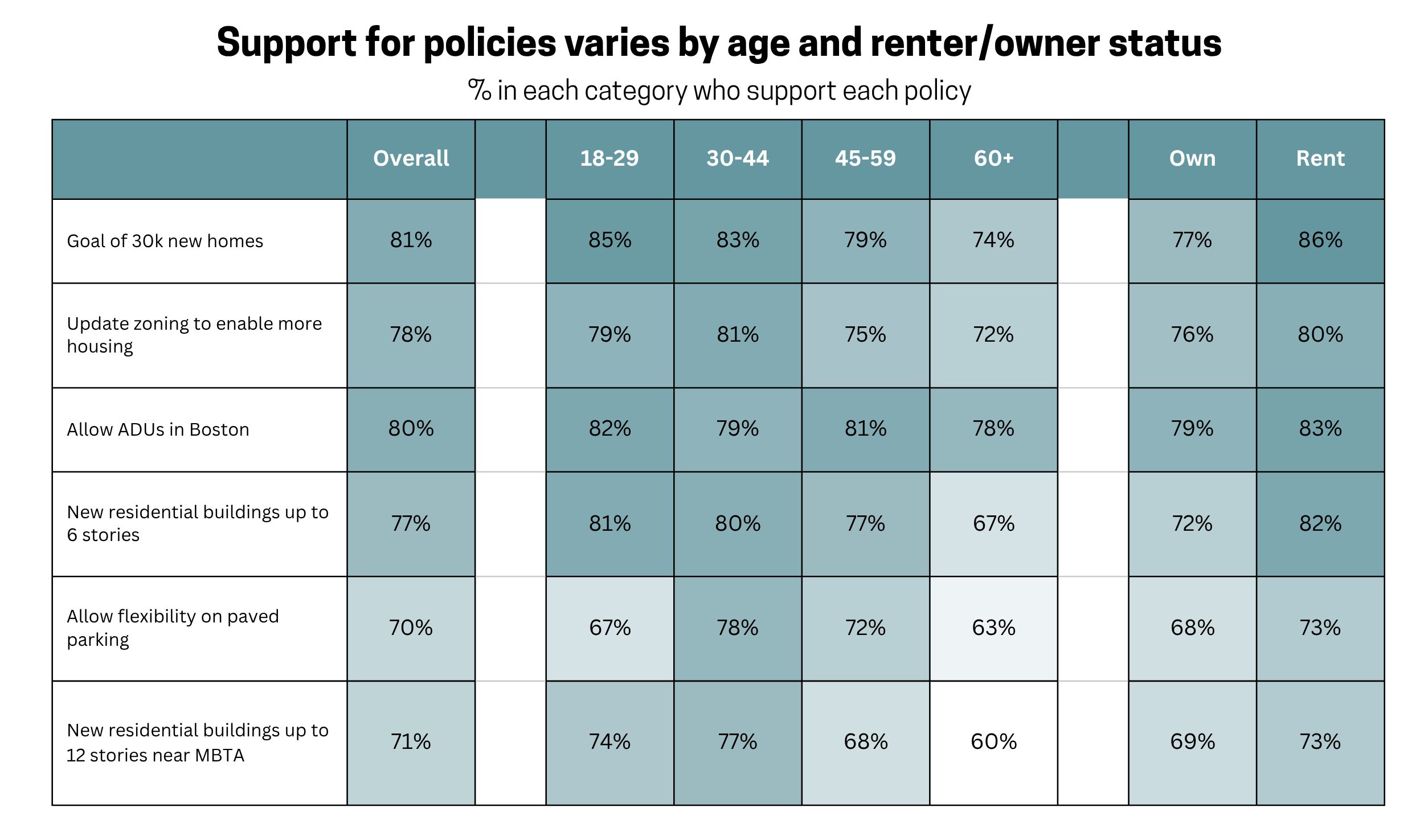 Given the desire for more action and dissatisfaction with current approaches, Boston residents showed broad support for a variety of policies that would make it easier to build more homes and increase housing choices across the city. Support for these policies was strongest among renters and younger households.