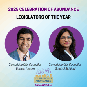 We are proud to honor Cambridge City Councilors Burhan Azeem and Sumbul Siddiqui as our Legislators of the Year. As co-chairs of the city council’ s housing committee they led the historic passage of eliminating exclusionary zoning in the city of Cambridge.
